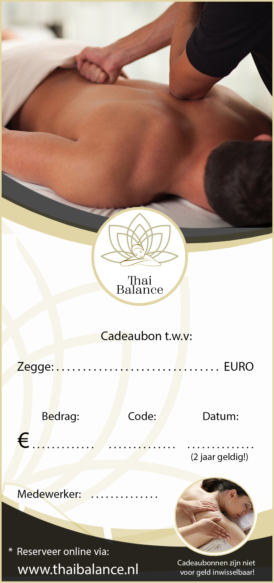 Met de cadeaubon van ‘Thai Balance Traditional Massage’ geeft u iemand een waardevol cadeau. U kunt zelf bepalen wat het bedrag wordt, wij vermelden dit op de cadeaubon